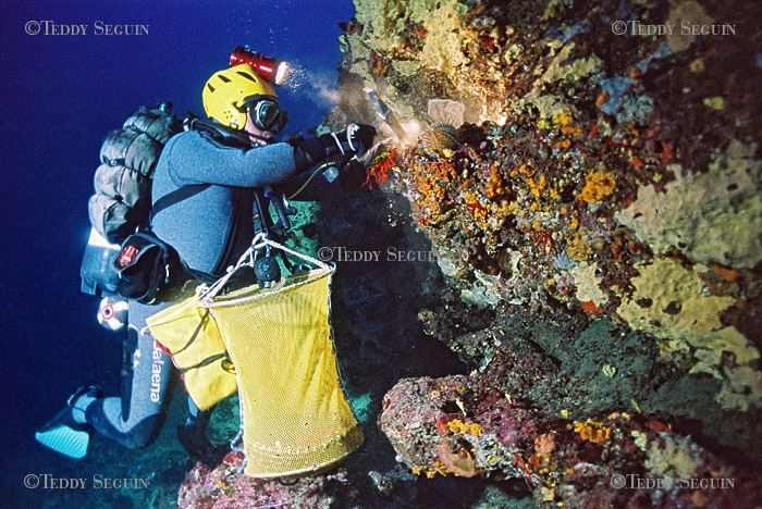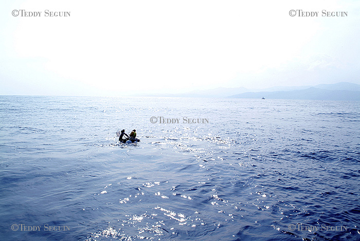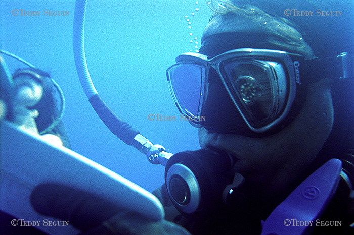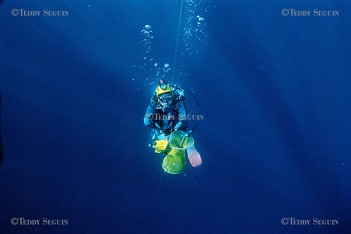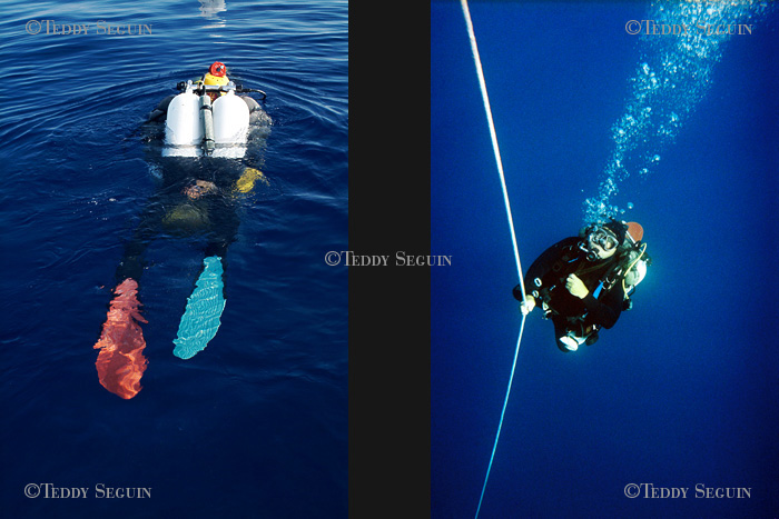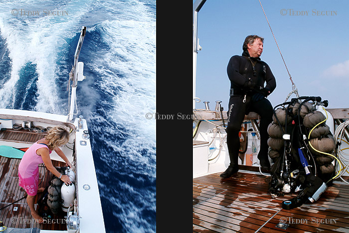 Coco marin à bord Blue marlin et compagne de Jean-Pierre, à la lourde résponsabilité de la préparation de tout le matériel necessaire à la plongée et assure la sécurité surface lorsque Jean-Pierre est sous l'eau. / plongée moins dix minutes, Jean-Pierre est déja sous l'eau, concentré sur sa plongée. Entre 90 et 110 mètres de profondeur, la pression est tré forte et surtout le plongeur subit un phénomène de narcose qui peut lui faire perdre ses moyens. La concetration dois donc être à son maximum du début jusqu'à la fin de la plogée.