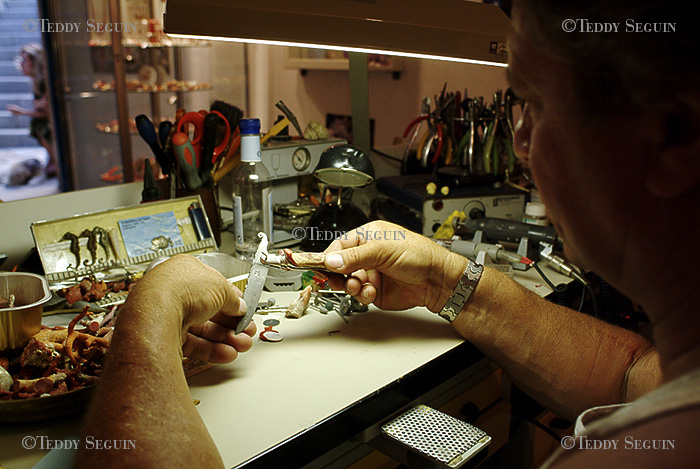 La petite boutique de corail de Jean-Pierre et Coco n'est pas souvent ouverte, mais lorsqu'il fait mauvais temps, en mer, on a une chance d'y rencontrer "le vieil ours" derrière son atelier affairé à sculter son corail.