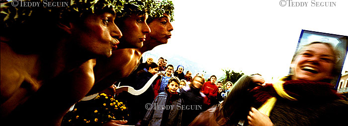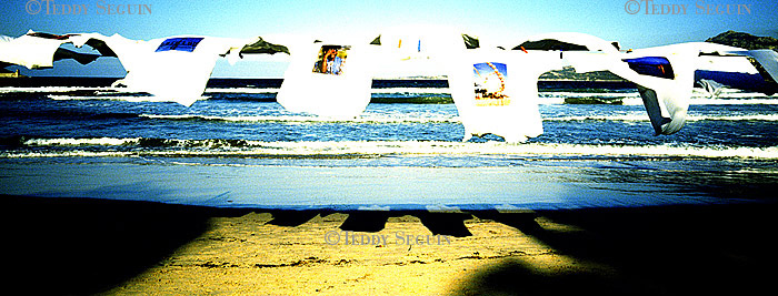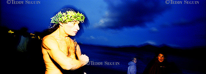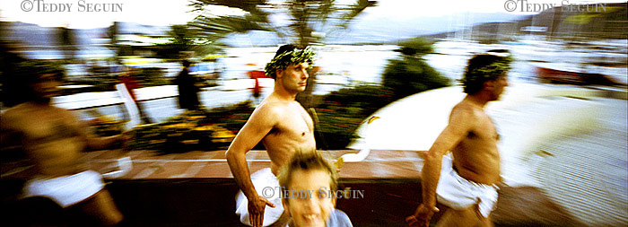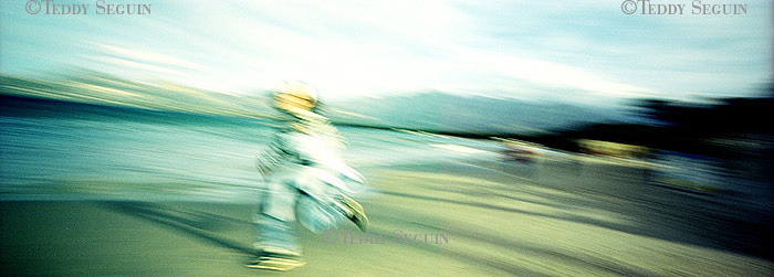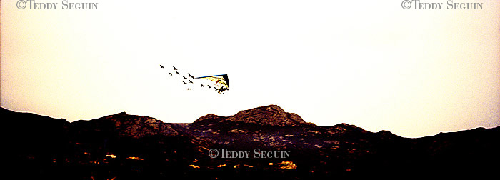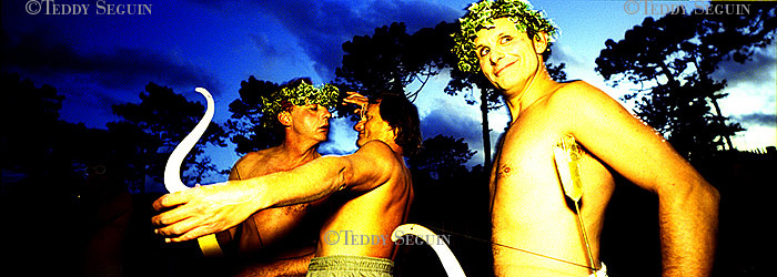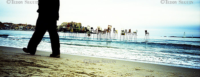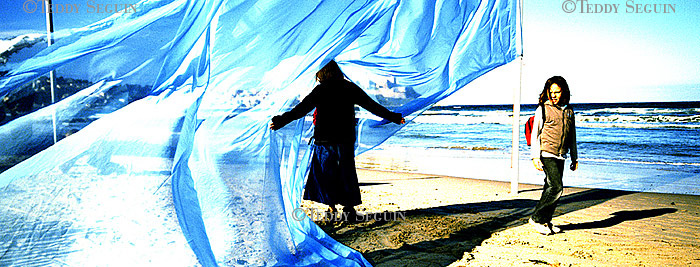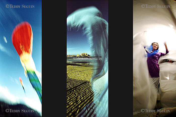 Un coup de vent et… flop, vous voilà plongé au milieu du festiventu. Sur quelle planète venez-vous donc d’atterrir ? Celle des arts, de l’utopie et de la légèreté. Une petite fille court sur la plage à la rencontre de roseaux-chaises, tandis qu’un homme-boule roule à sa rencontre. L’instant d’après des éphèbes tentent de vous emporter avec eux, mais, juste à temps vous voilà propulsé dans le ciel, accroché au bras du trapéziste volant. Lorsqu’il vous lâche votre chute est amortie par un souffle léger qui vous dépose sagement sur la plage. Alors que vous pensiez enfin pouvoir filer, un drôle d’ULM suivi d’une troupe d’oies vous emmène en balade et vous dépose dans une zone de turbulence musicale. Mais, tout à coup, c’est le silence dans la cité du vent. Le festival se termine et vous ne rêvez que d’une chose : retrouver dans une course folle la petite fille de la plage.